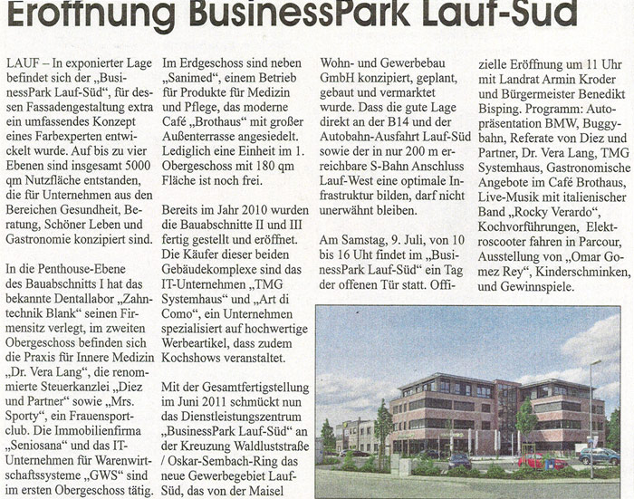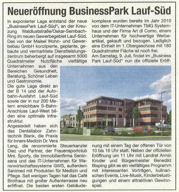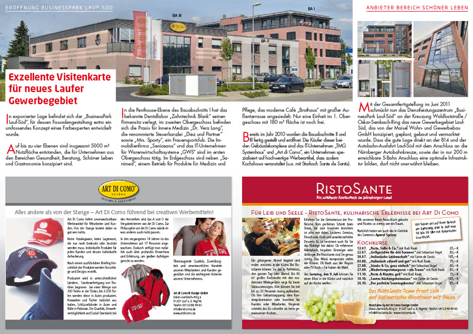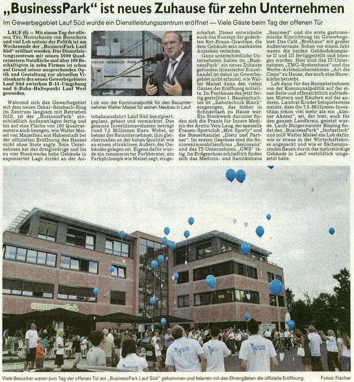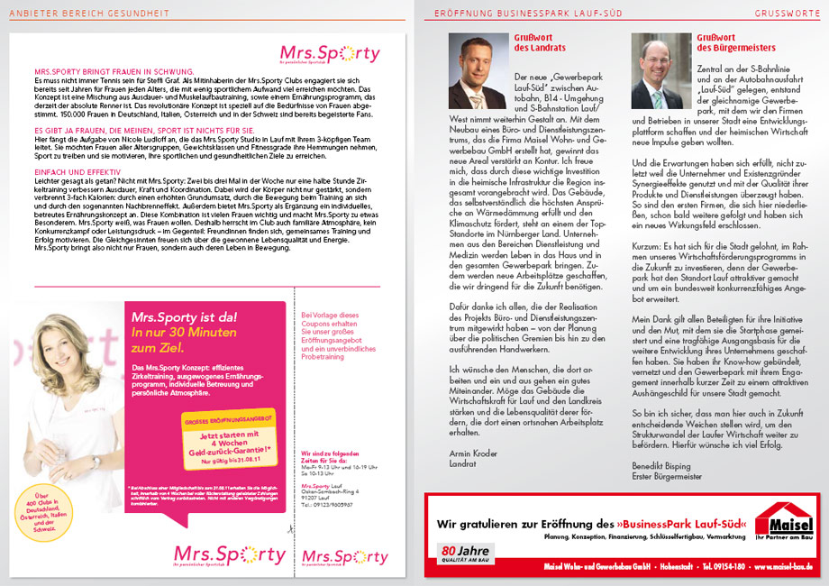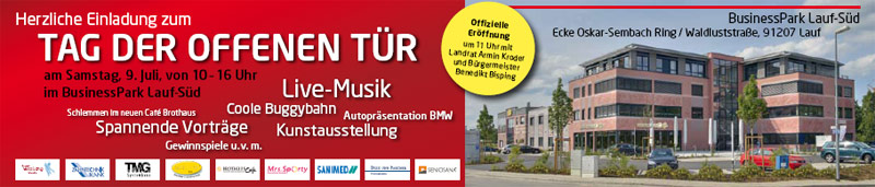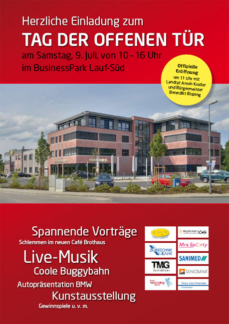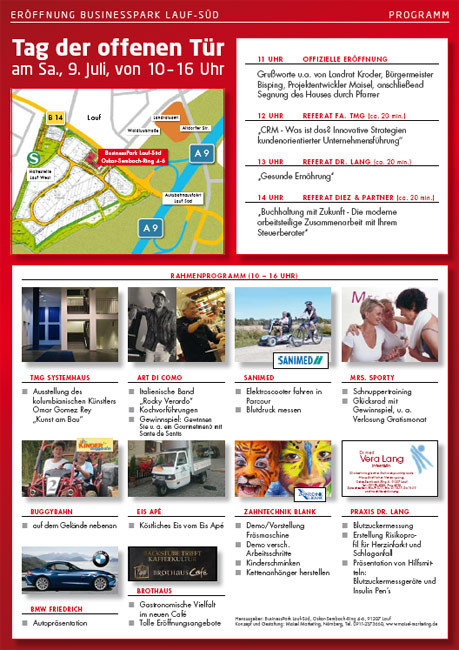 Für den BusinessPark Lauf-Süd im neuen Gewerbegebiet der Stadt Lauf a.d.Pegn. wurde seitens der ansässigen Unternehmen ein Tag der offenen Tür veranstaltet. Maisel Marketing war für die komplette Organisation, Planung, Buchung und Budgetierung verantwortlich, zudem für die Koordination am Eröffnungstag selbst. Eine Woche vor der Veranstaltung ist an über 20.000 Haushalte in der Region eine hochwertige 12-seitige A4 Broschüre verteilt worden, mit Infos zu den Betrieben, dem Baufortschritt, Grußworten von Landrat und Bürgermeister und einer Programmseite mit allen Eventmodulen. Weiterhin wurden in der regionalen Tageszeitung und einem Wochenblatt Anzeigen geschaltet und diverse PR Aktionen initiiert. Insgesamt war das Event 6 Mal – Anzeige nicht mit einberechnet – in den Medien präsent. Eine groß- und zwei kleinflächigere Außenwerbungen rundeten die Werbeleistungen ab.