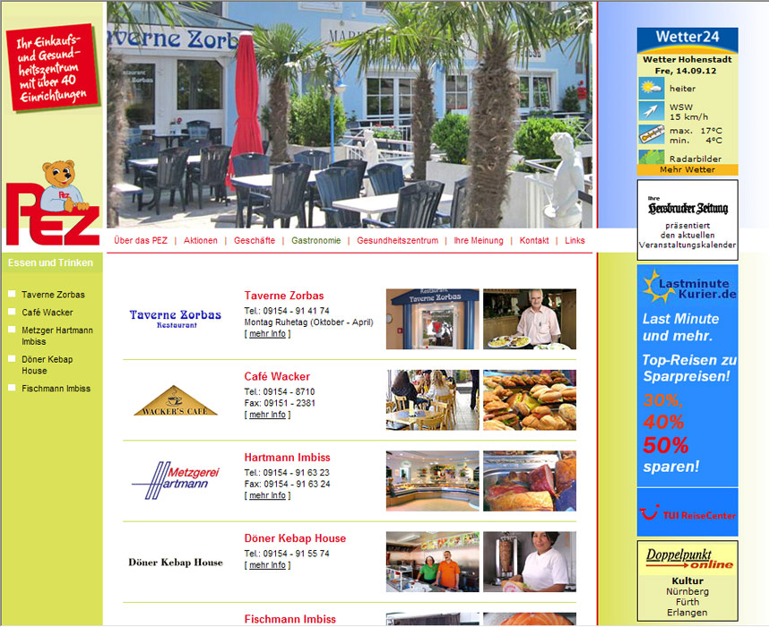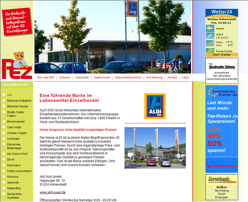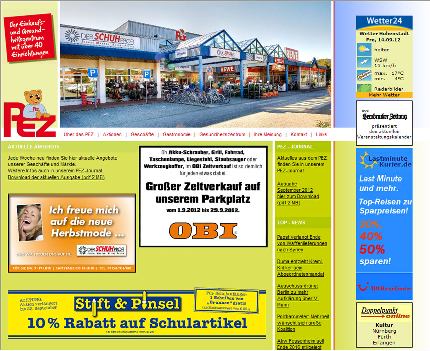 www.pez.de überarbeitet und der neuen PEZ CI angepasst. Das frische Apfelgrün und das bekannte PEZ-Rot schaffen einen attraktiven  Kontrast, das große, teils wechselnde Bildmotiv im oberen Bereich garantiert Spannung für das Auge, ohne es jedoch zu überfrachten. Moderner und übersichtlicher gestalten sich nun insgesamt die neuen Seiten. Bislang haben jeden Monat viele Tausend Besucher die Homepage angeklickt. Dass dies so bleibt bzw. die Klickrate noch steigt, dafür sorgen wöchentlich neue Angebote der Geschäfte, zu finden gleich auf der Startseite. Zudem kann immer das aktuelle Kundenmagazin „PEZ Journal“ online betrachtet werden. Alle Infos zu den einzelnen Geschäften, Gastronomie- und Gesundheitseinrichtungen – von der Telefonnummer bis hin zu den Serviceleistungen – sind unter den weiteren Menüpunkten komplett aufgeführt. Wichtig ist die Meinungsabfrage. Diese kann online – auch anonym – mitgeteilt werden. Vorschauen und Rückblicke auf Aktionen sowie attraktive Links und Banner runden das Onlineangebot ab.