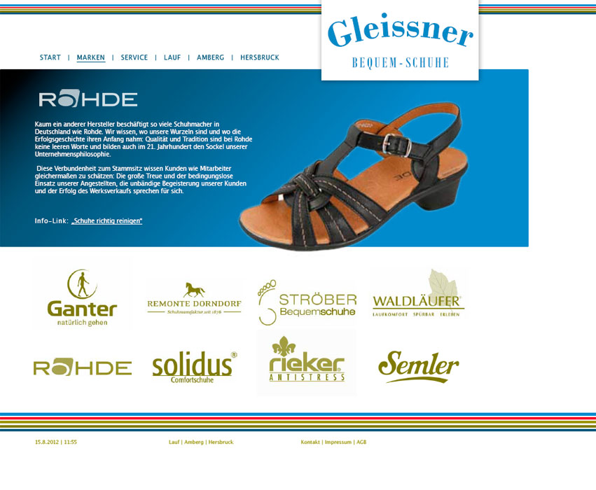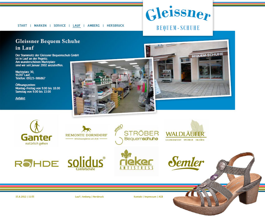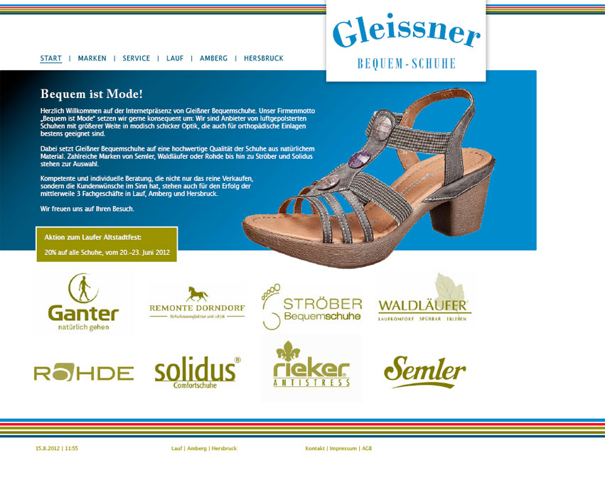 Für den Kunden Gleißner Bequemschuh GmbH entwickelte Maisel Marketing einen Internetauftritt. Dabei wurde der gewünschte Blauton des vorhandenen Logos in das Layout mit aufgenommen, der mit dem kontrastreichen Weiß gut harmoniert. Grundidee beim Layout war weiterhin, den Schwerpunkt auf die Produkte, sprich die Marken zu legen, die auf allen Seiten einsehbar und anklickbar sind. Das Menü ist einfach und übersichtlich gestaltet, die weniger wichtigen Punkte sind in einer zweiten Leiste im unteren Teil angeordnet. Der angenehme Grünton der Markenlogos und das attraktive Schuhmodell als Eyecatcher runden das Layout hervorragend ab.